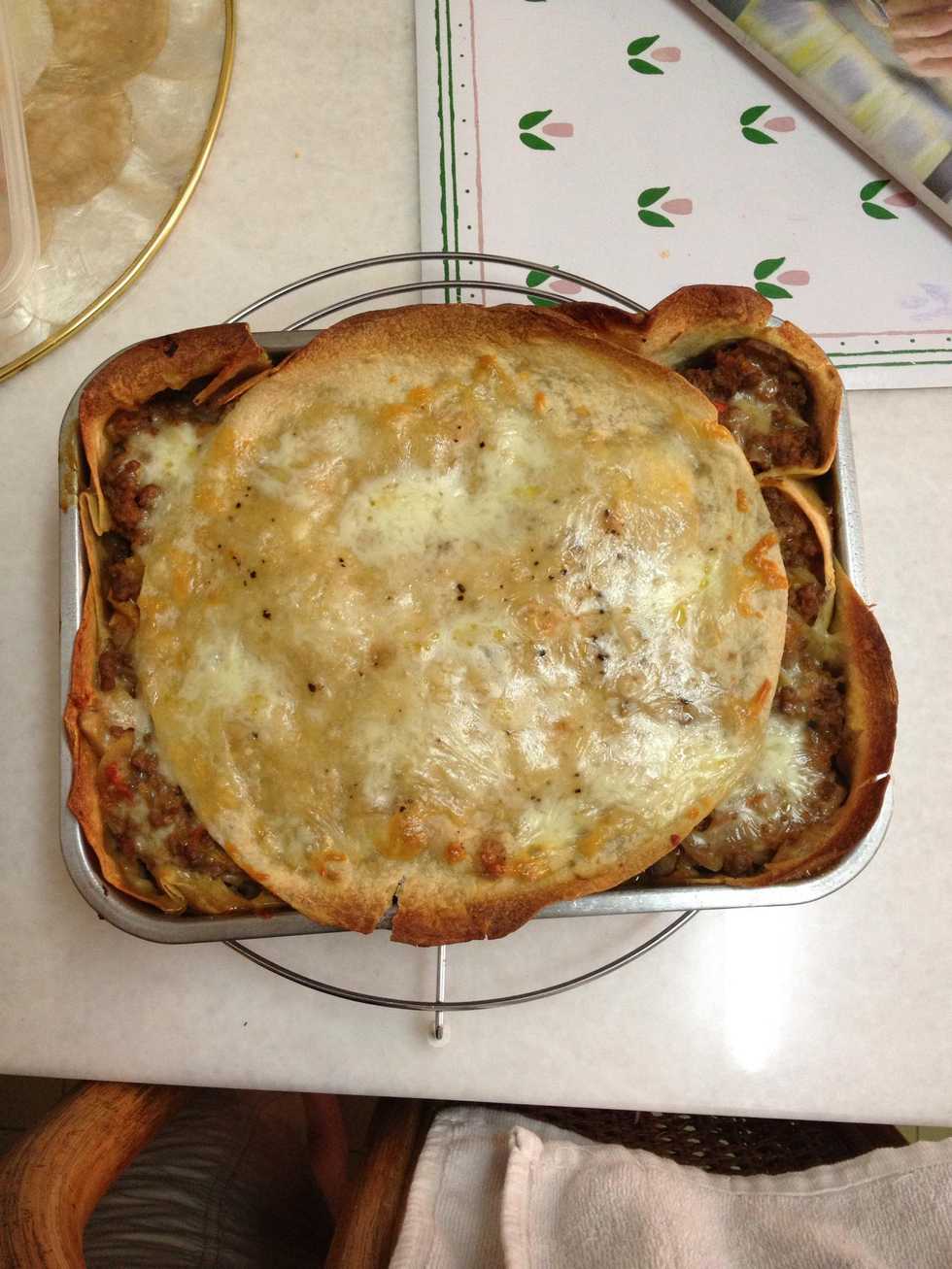 Place another tortilla on top of the pie to make the pie crust top. And add more cheese
