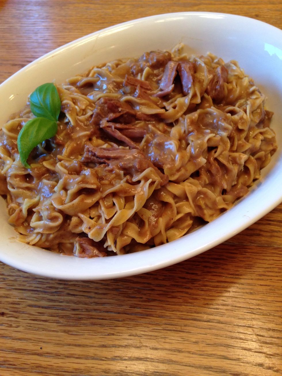 After beef is cooked, remove lid and add entire package of noodles.