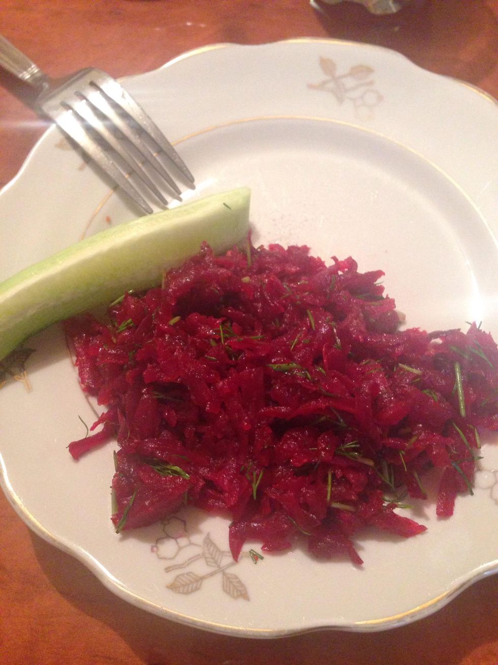 At last add the sauce and chopped dill to the grated beetroot and mix well