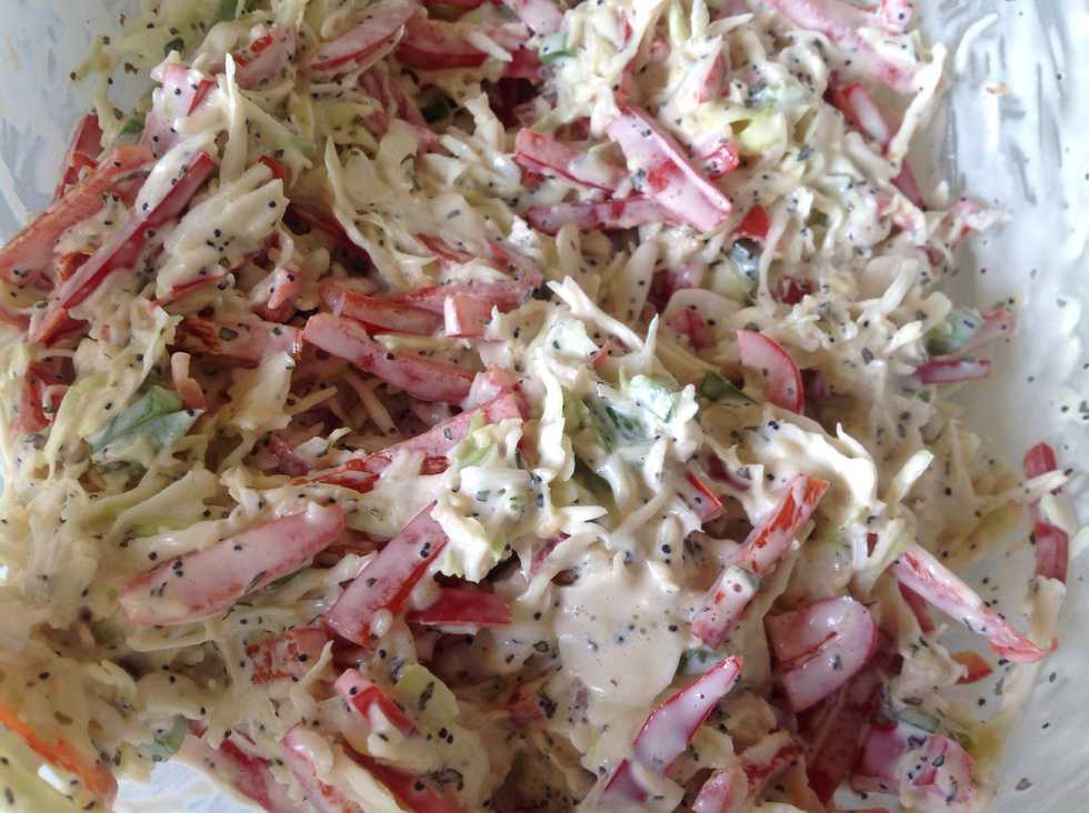 Give the the Basil Poppy dressing a mix & pour about half of it on the cabbage & peppers. Mix well, adding more dressing as you go. Mix in the remainder of the dressing & chill at least one hour.