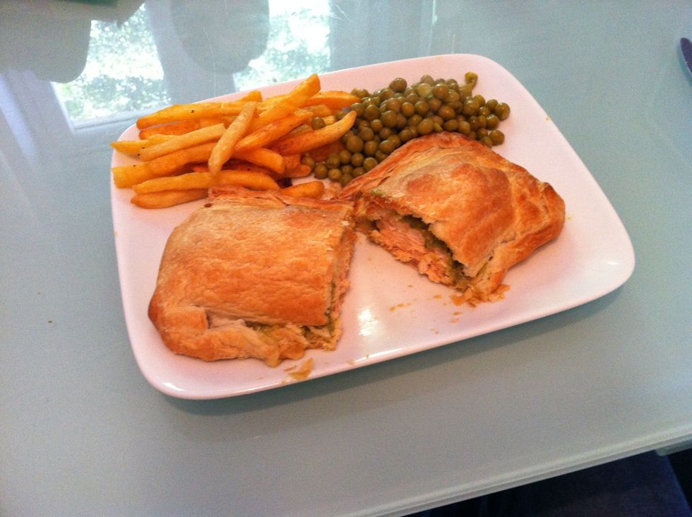 Fold the pastry sheet over the fillet as shown and pinch the edges together