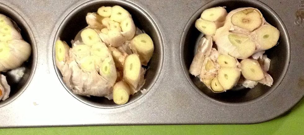 Chop their tops off, making sure the inside of each clove is exposed. Stuff them into a muffin tin. Not super packed, but get them in there nice & snug.