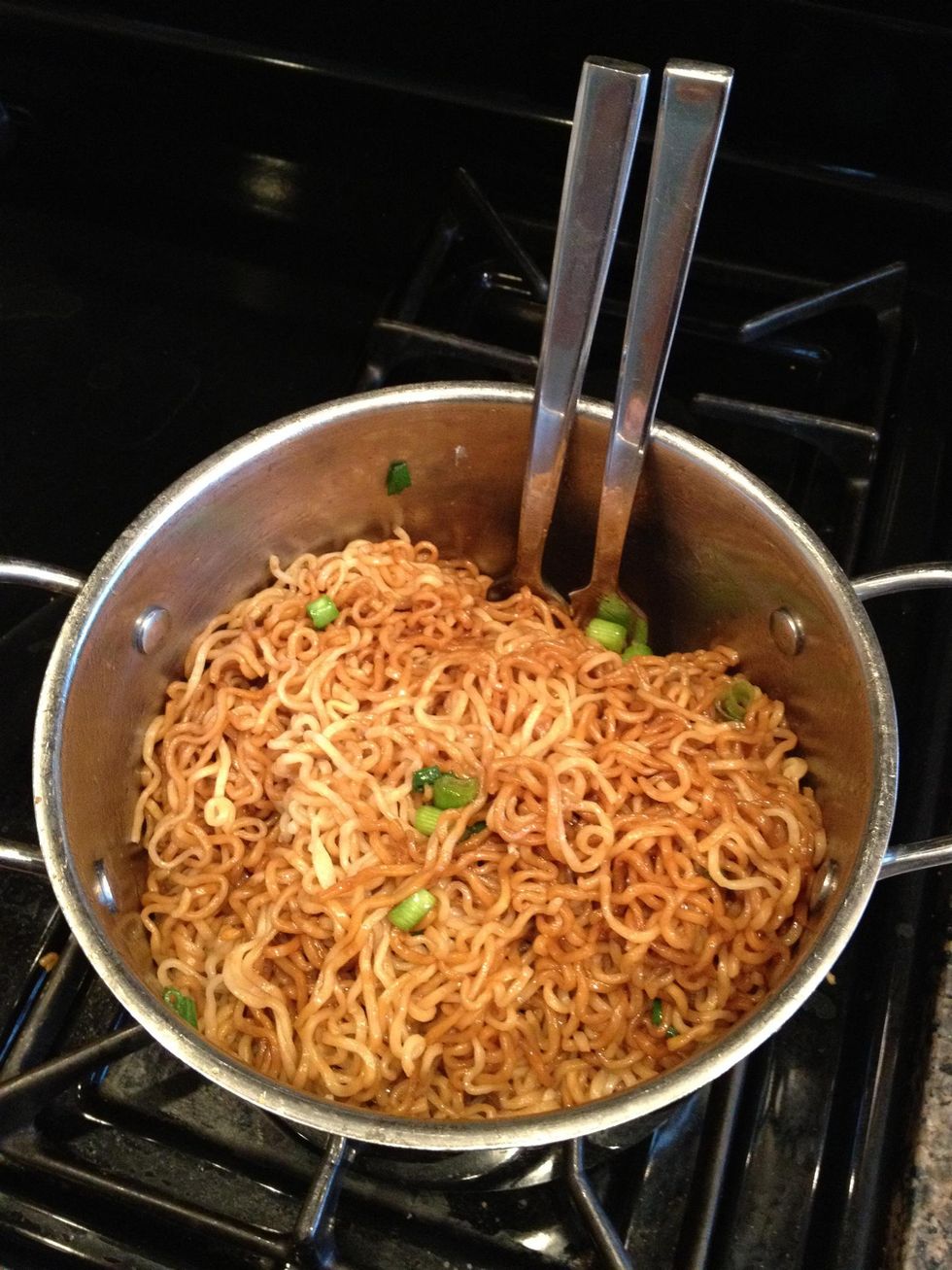 Stir in green onions and sauces till the seductive aroma of noodley goodness astounds your senses and then eat! ( also really good with regular onions and eggs )