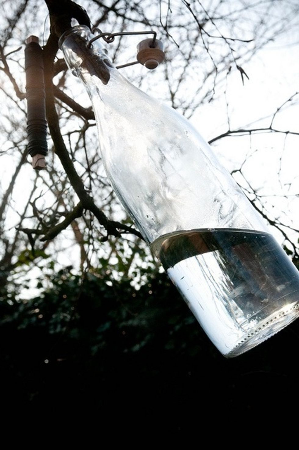 Take a branch which is about 1 or 2 cm thick and hangs down, so the weight of the (full) bottle will not break your branch.