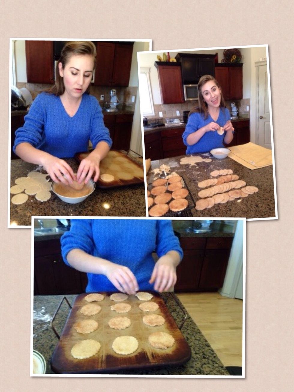 After, use the cookie cutter to cut the dough into small circles. Peel away excess dough and put the cookies in the cinnamon sugar mix. Ensure that the entire cookie is covered evenly. Place on stone.