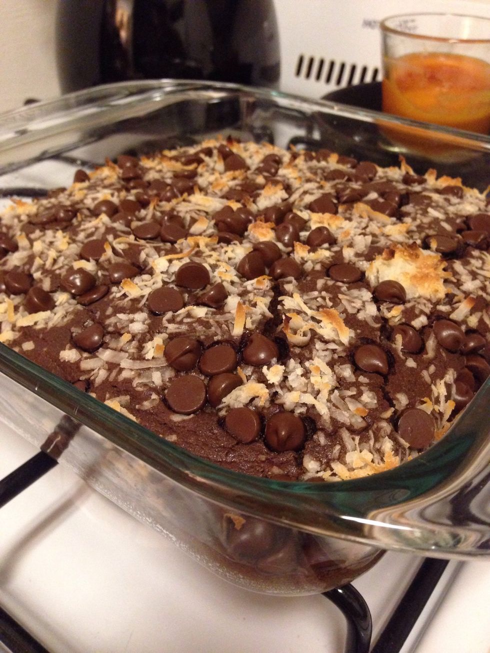 Sprinkle your chocolate chips and optional toppings over the batter and bake in a preheated 350*f oven for 35-40 minutes. (If you can't tell, I love coconut) :)