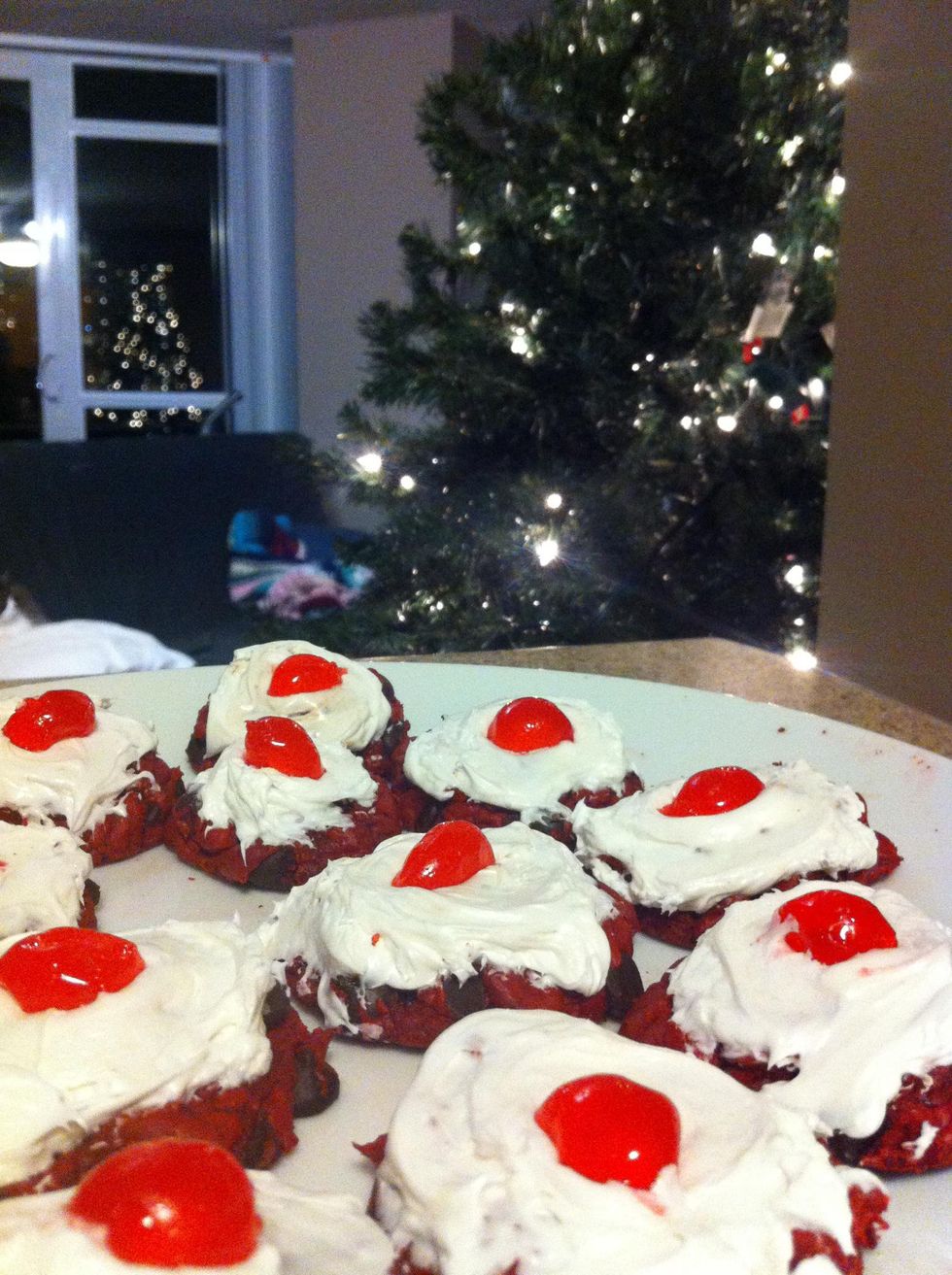 Once cooled, the cookies are ready to be frosted and topped off by adding a slice of cherry & serve. This batch will yield approximately 48 cookies. (Depending if you have men or kids in the house).