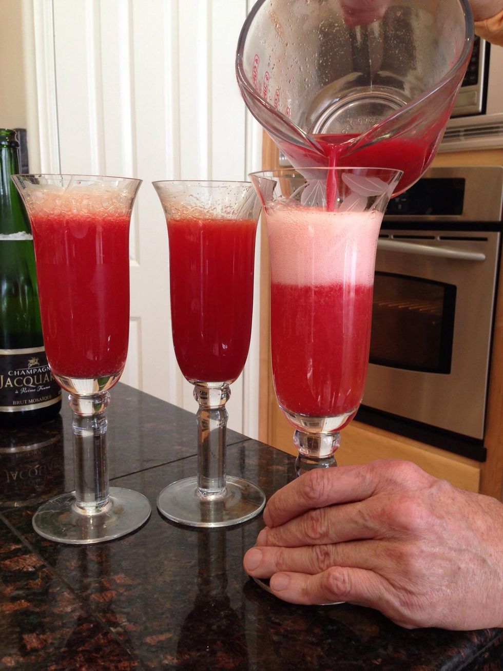Slice your blood oranges in half.Juice the 12 halves in the juicer.Pour the champagne into glasses.Slowly pour the blood orange juice into each glass.Aren't they just a lovely color?Enjoy!