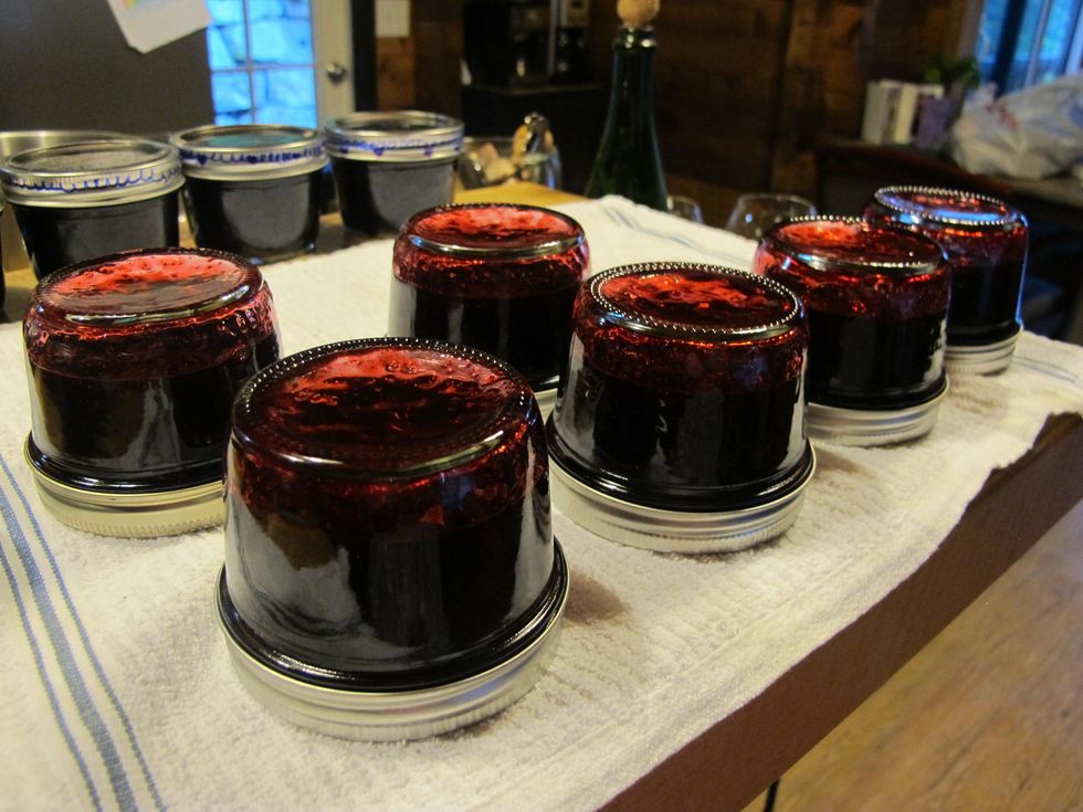 First wash jars and lids with hot soapy water. Then sterilize by placing them in boiling water for about 3 min. Place on a clean towel to dry.