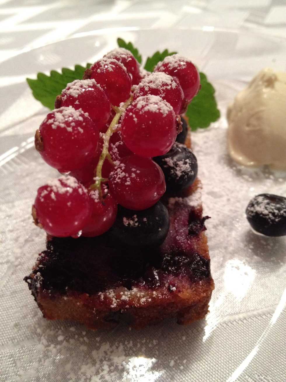 And finally: dessert. Take your cake and cut it into pieces, serve with fresh blueberries (and other berries after your desire as you can see on the picture) and powdered sugar.