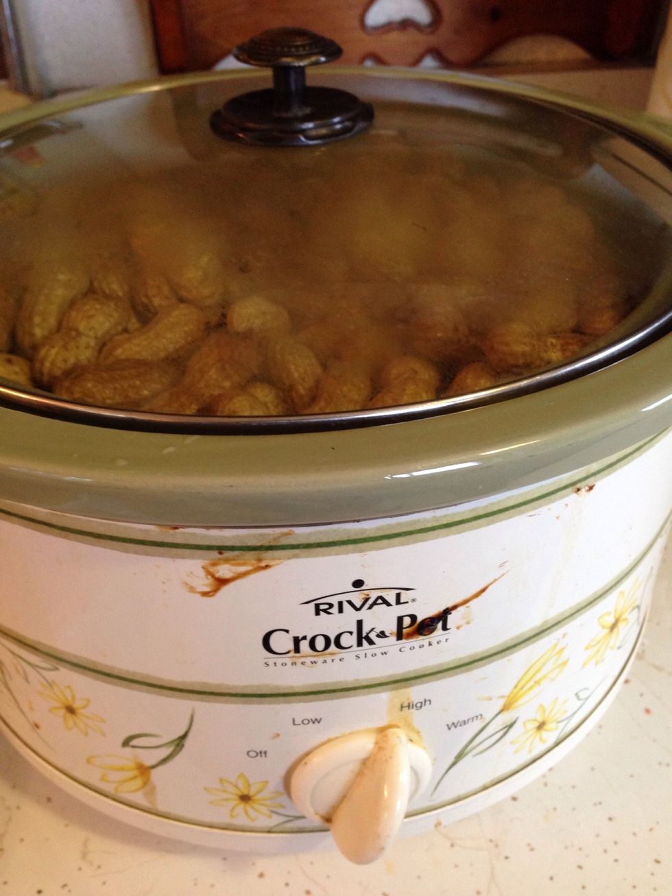 Fill crockpot with water to cover peanuts...stir...cover...cook on high until peanuts are nice and soft stir once in a while...24 hours in crockpot depends on the pot..eat and enjoy! Any flavor doable