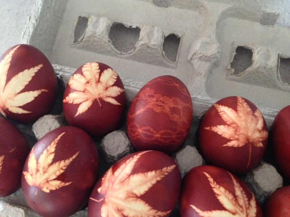 Cut your hose into 4" squares, ensuring that there are no runs in the pieces you'll use. Choose a leaf or flower that is perfectly flat, not bubbling, and place it on the egg.