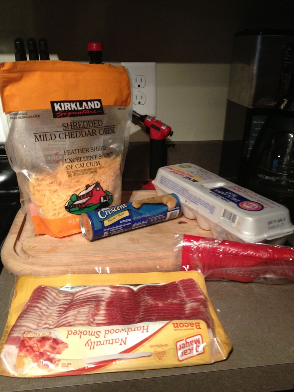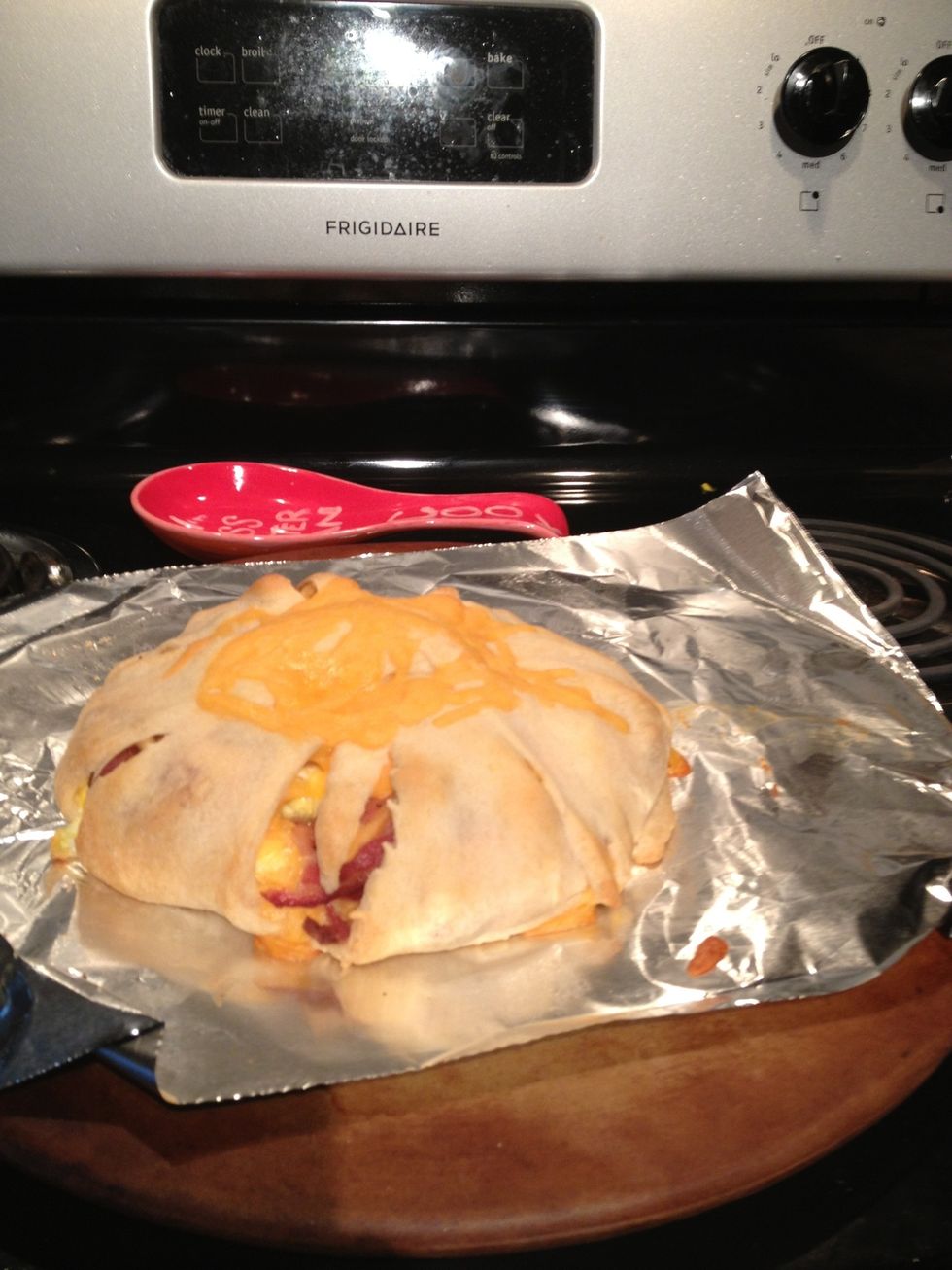 Layer in bacon, eggs, and shredded cheese