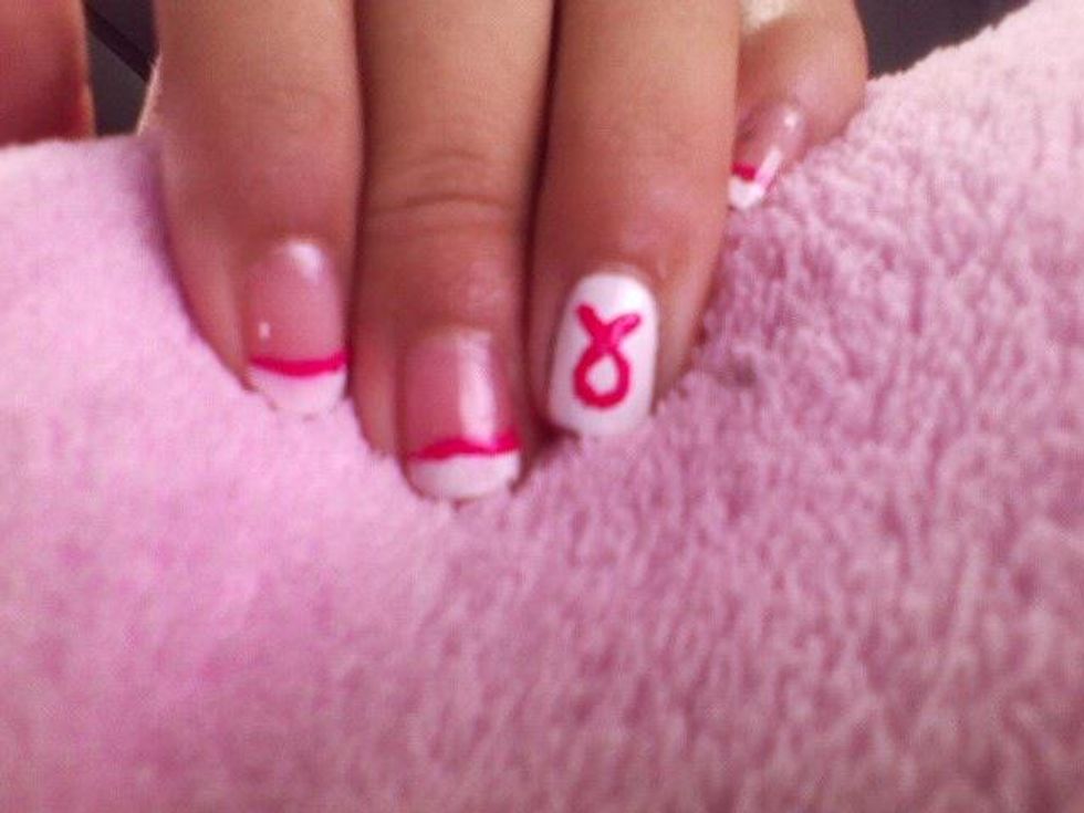 With a pink striper, paint a bow shaped figure on your ring finger. If you don't have a striper, you can make it from an old nail polish brush and cut most of the bristles off, like above.