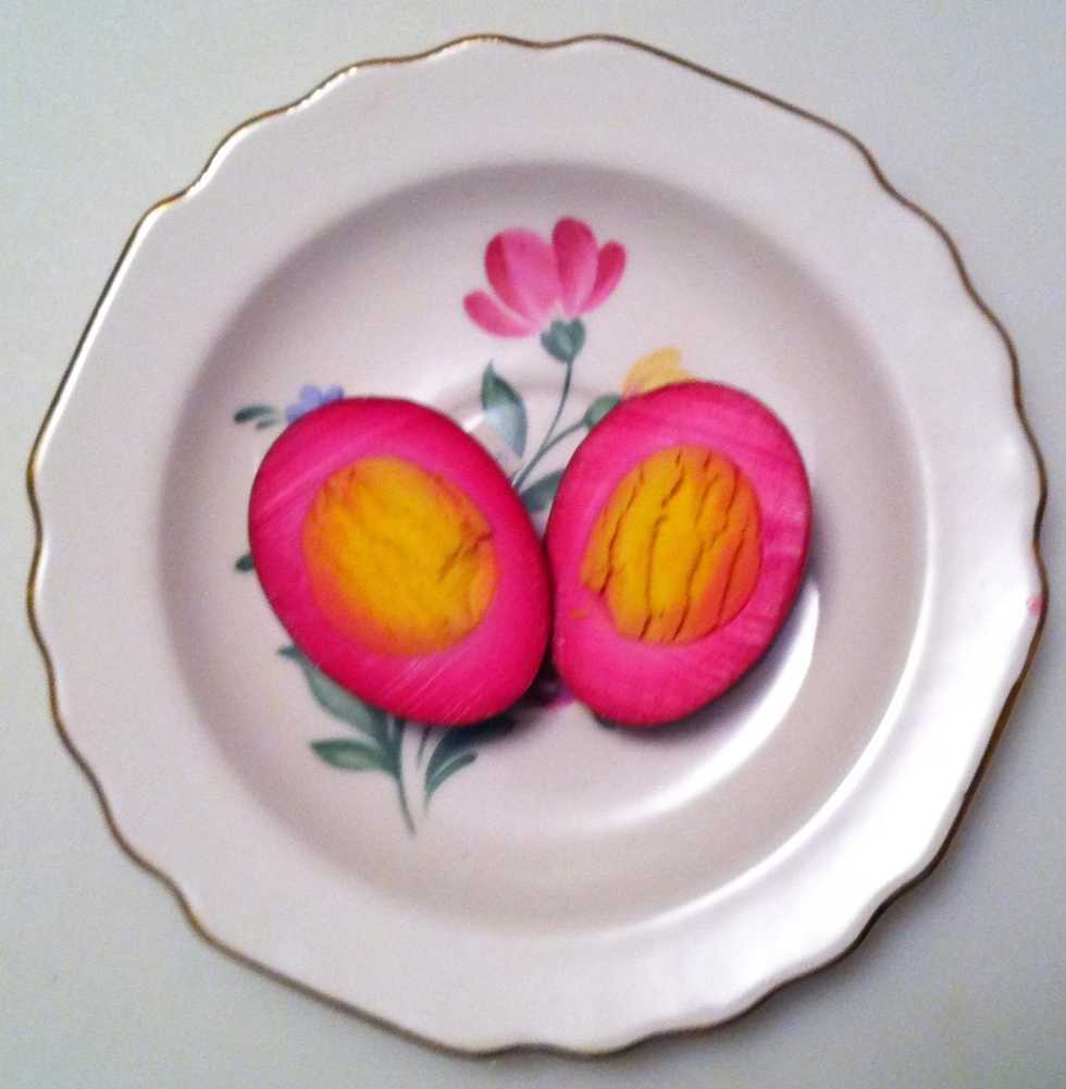 Bring the beet juice and flavorings to a boil. Pour over the eggs and onions. Place in fridge for two or three days.