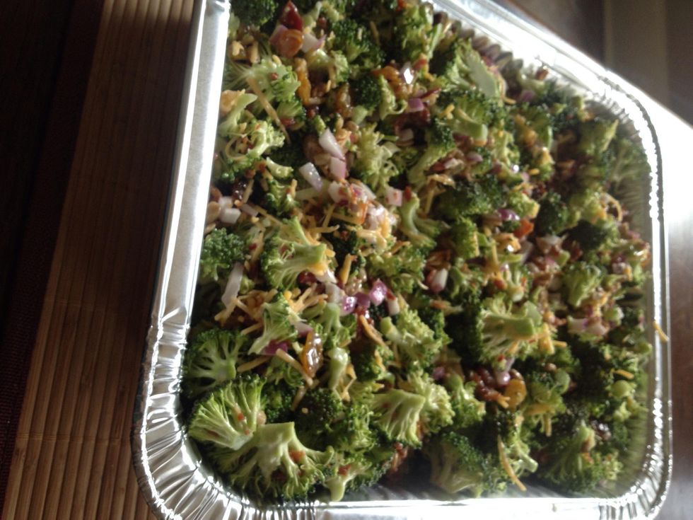 In a bowl or serving dish, combine the broccoli and red onion. Add golden raisins...