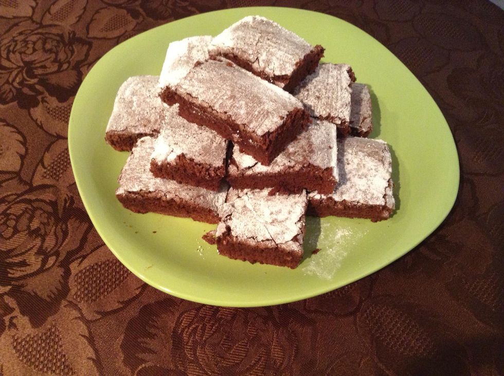 Dust with SIFTED confectioners sugar and cut into smaller brownie pieces. The sugar cloud tastes way better than the cocoa cloud by the way.