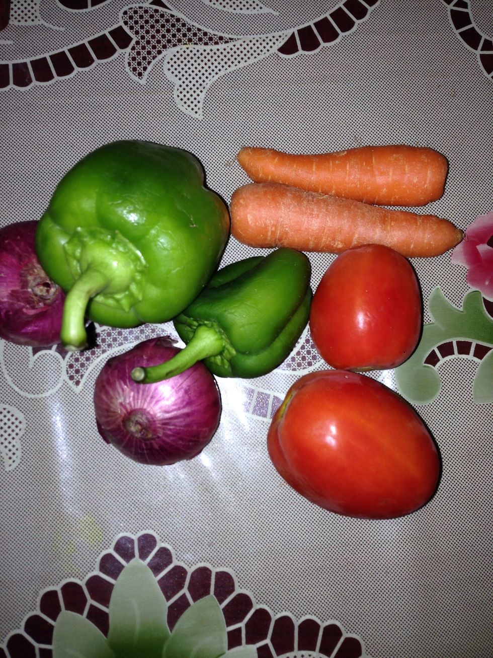 3. Take capsicum , tomatoes ,carrots and onions . 4. Cut them . Take them and spread them on the bread .