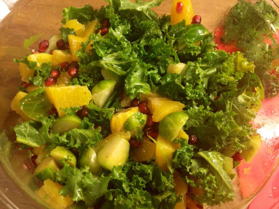 Like so..broussel sprouts, kale and orange pieces mixed together. Now add the pomegranate seeds.