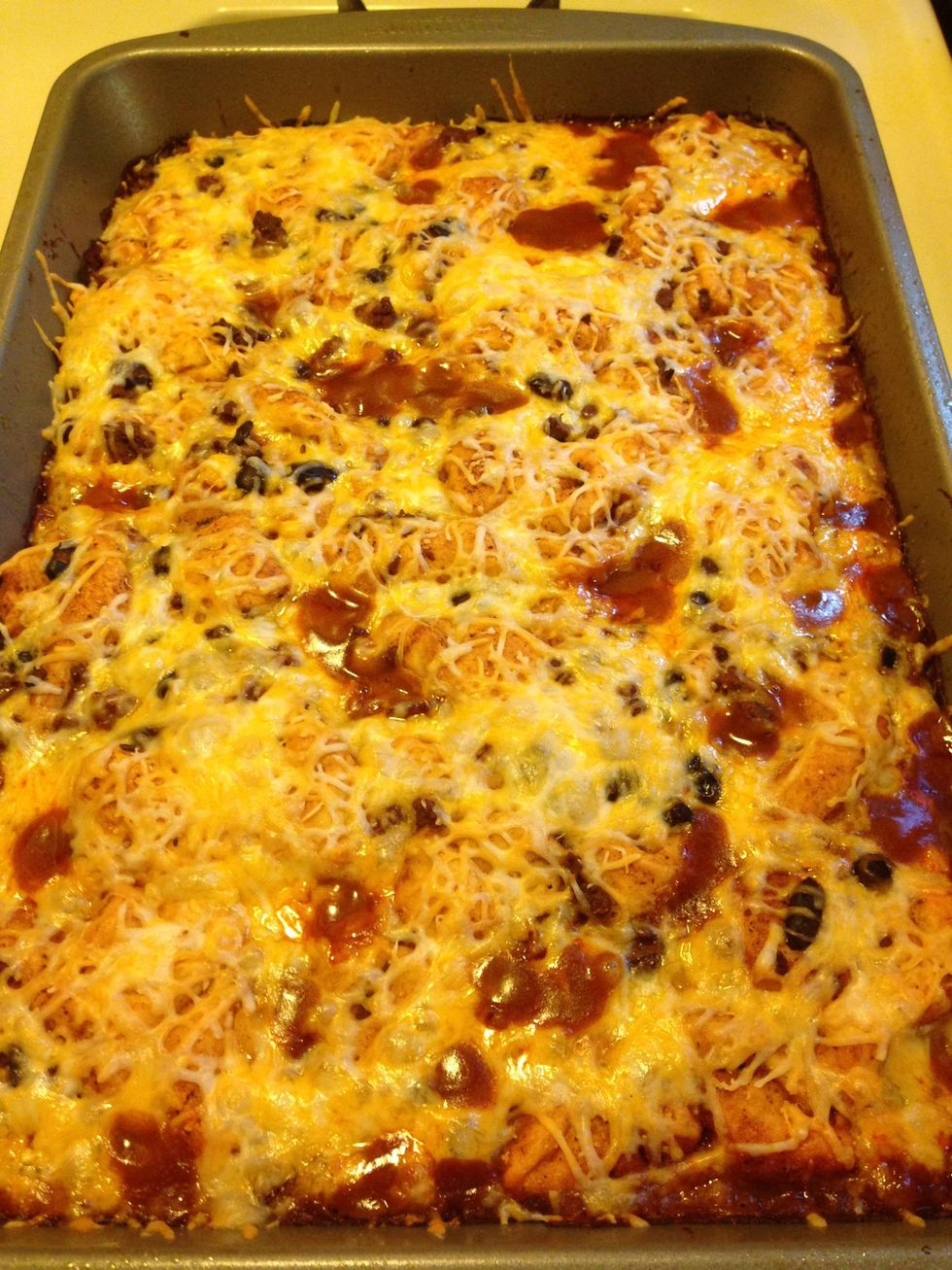 Drain grease from meat and return to pan. Add the taco seasoning, enchilada sauce, tomato sauce, black beans, and corn. Stir to combine.