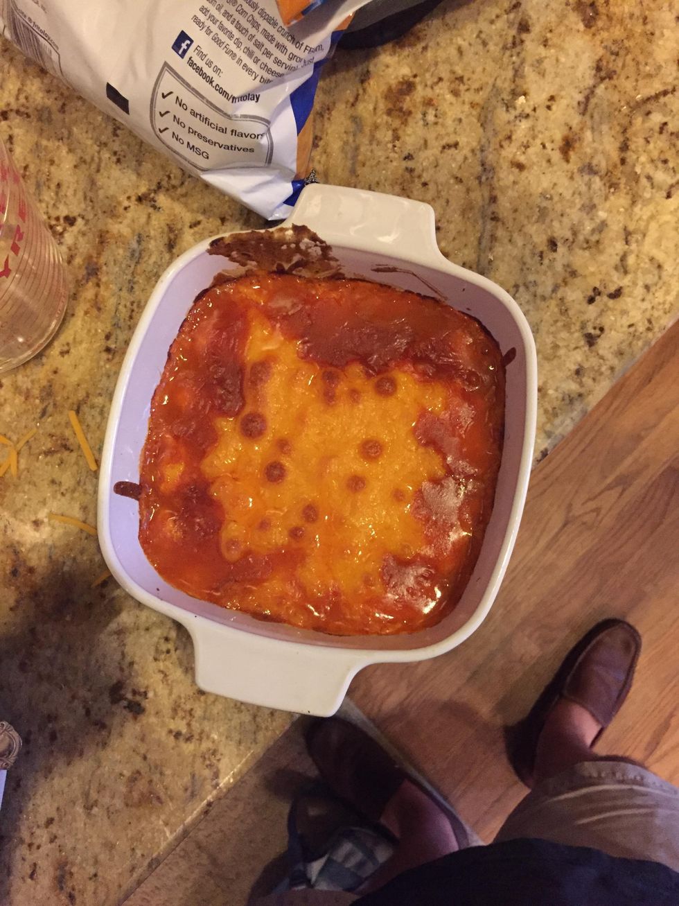 2. Spread the shredded chicken about 1/2 inch deep in the serving tray