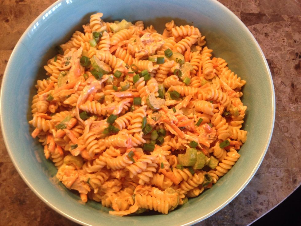Pour ranch into mixing bowl and add buffalo sauce to taste. I like it spicy so I added about 3/4 of the bottle.