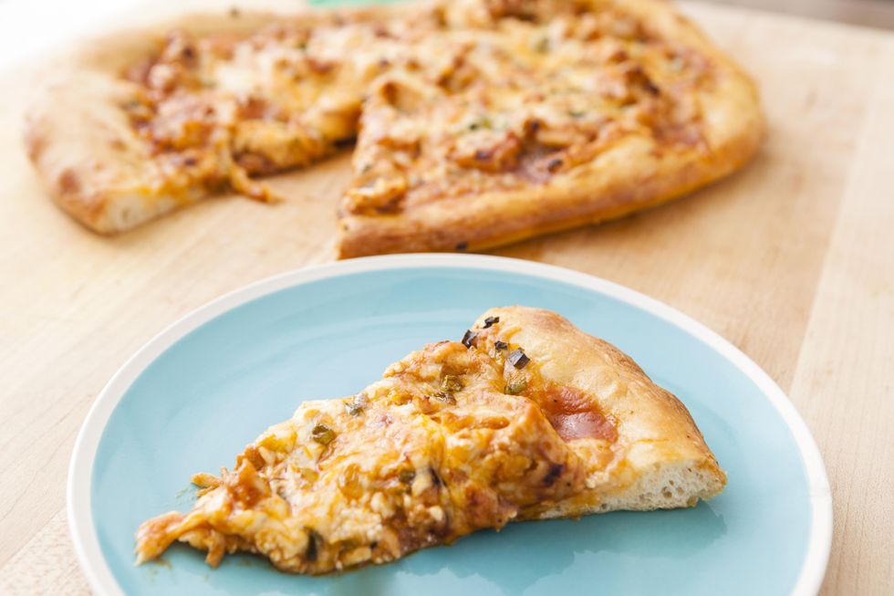 After cooking the crust for 5-10 minutes, pull out the crust and cover the dough with your buffalo chicken pieces and sauce.