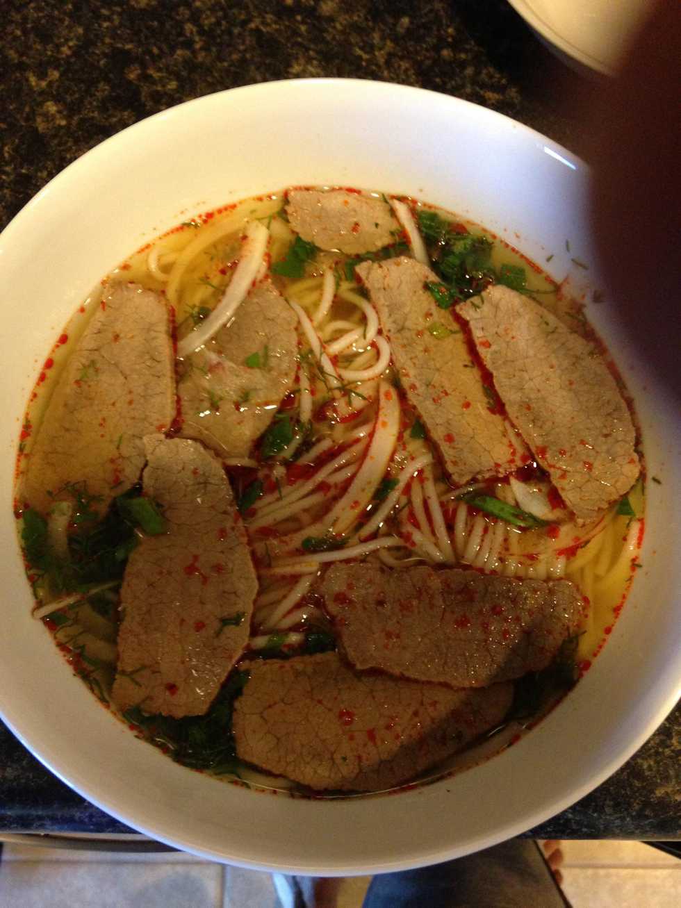 In a pot of water add onion, lemongrass, salt, and sugar. Then let boil. Put in a piece of eye round beef. Afterwards place on low and leave for around 1/2 hour or until the meat is cooked