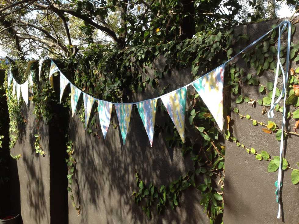 Now! Sandwich the open end of the first flag inside your doubled over tape to give a neat finish. Keep sewing beyond the flag for 2 cm then do the next.. And the next..