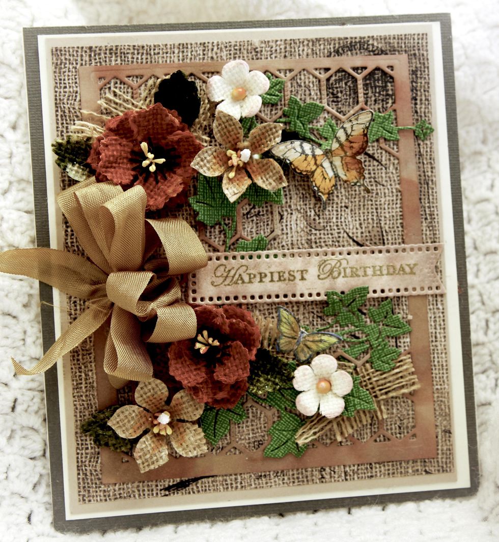 I made the burlap leaves using the same technique and colored each one with green stamping ink. I hope you are inspired to try this out. It was a lot of fun for me to do these flowers for my card.