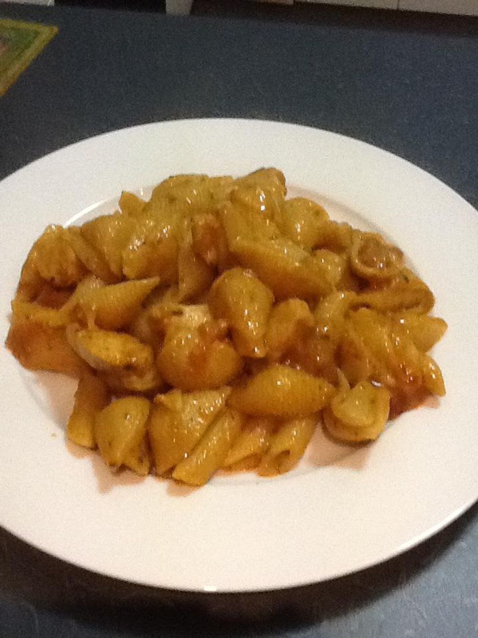 Ingredients: 1 chicken breast skin off 400g of pasta shells 1 jar of butter chicken Items 1 pot Wok Water Oil Strainer