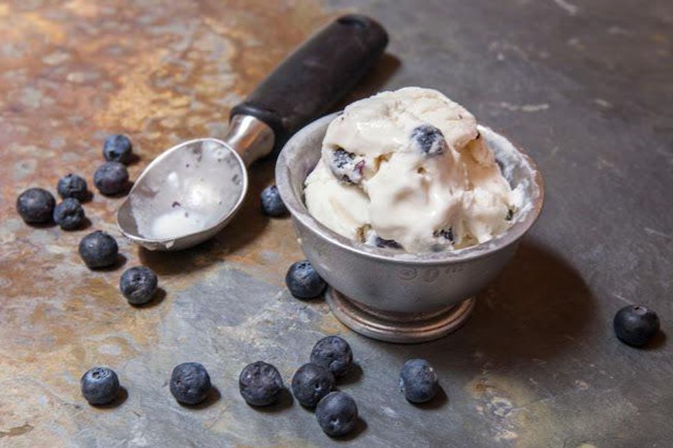 Process the ice cream for about 25 minutes or so, then add in the blueberries. Add them slowly and push them down into the mixture as so that they're evenly distributed through the ice cream mixture.