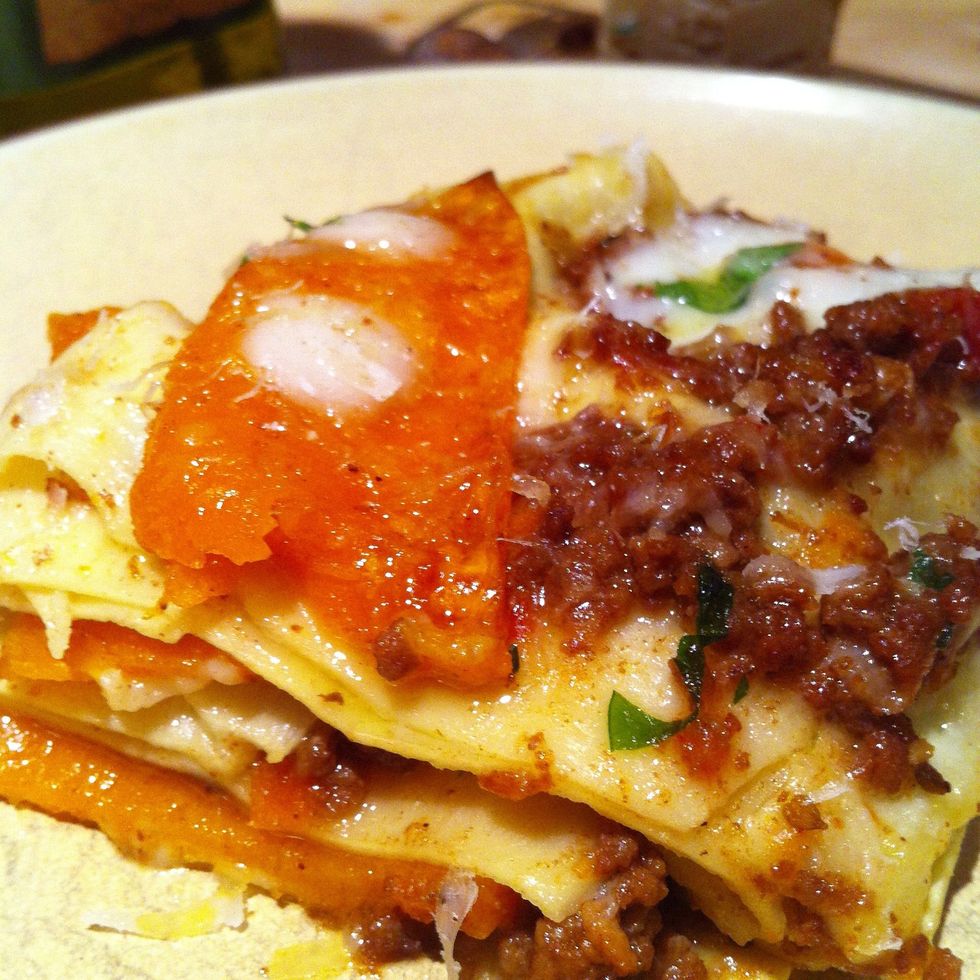Cook lasagna for 3 min in salted boiling water. Drain, ice bath & dry. Butter pan, 1C Bolognese, noodle, Bolognese, Bechamel, NMGPH (Nutmeg, Grana Padana, & Herb), Butternut Squash...repeat x2