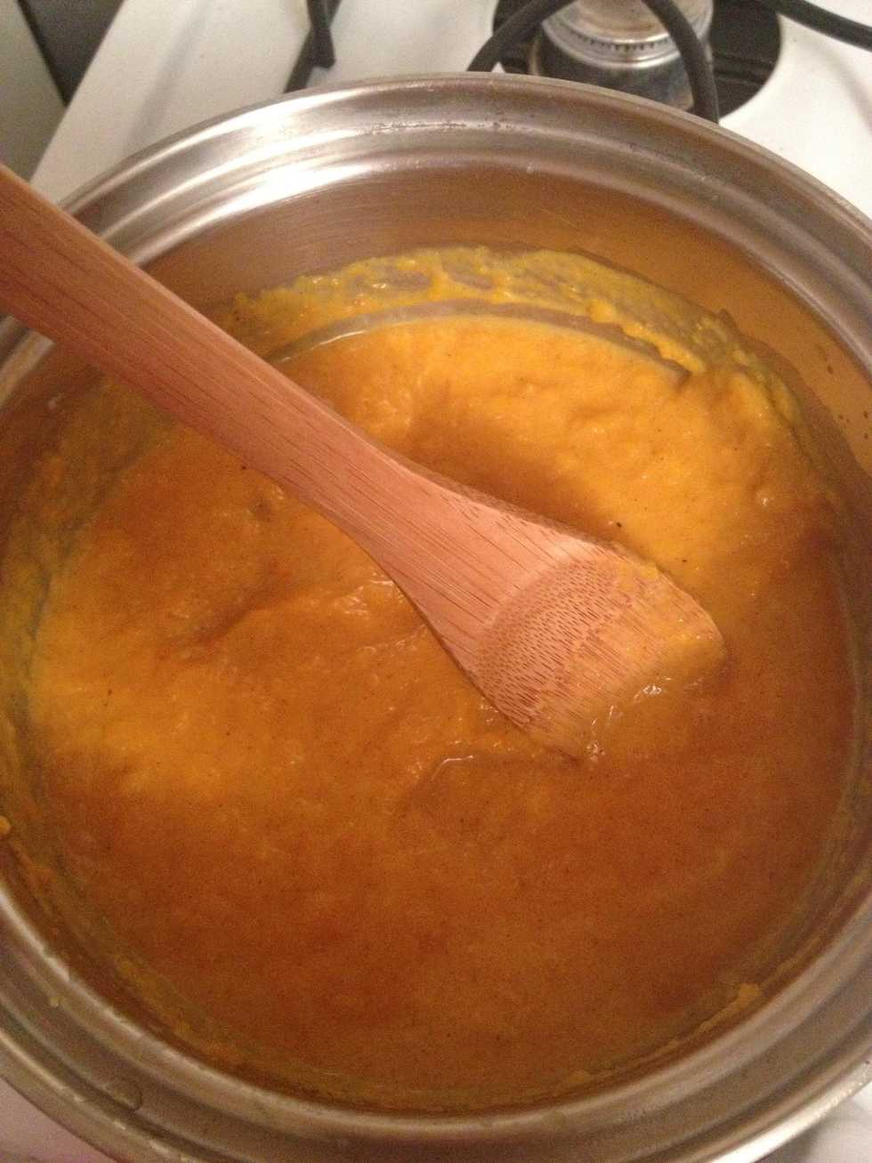 Mash the squash until its soft no really big chunks. I don't have a blender, but if you do this would probably be easier.