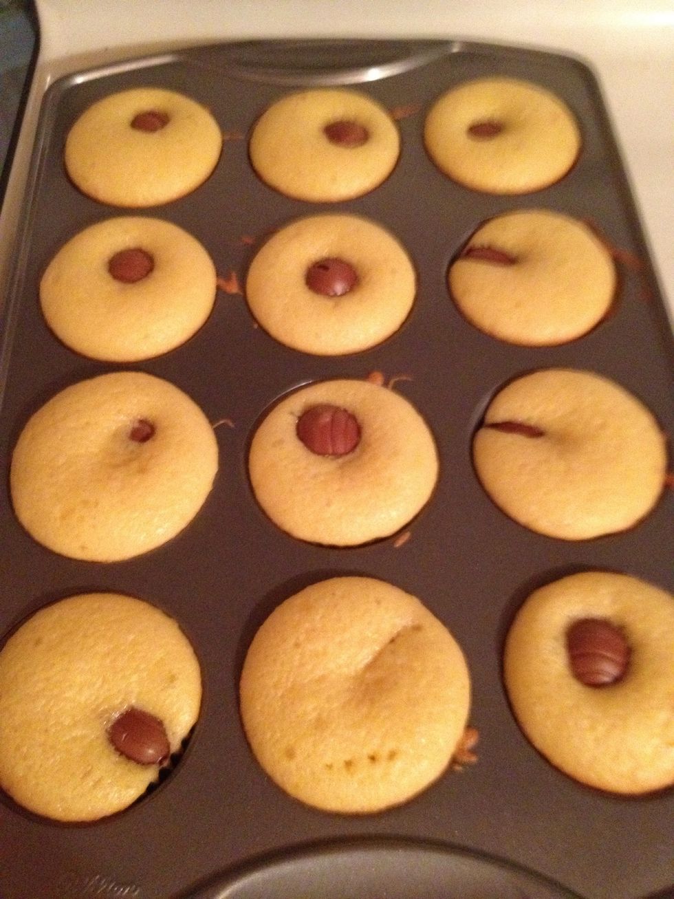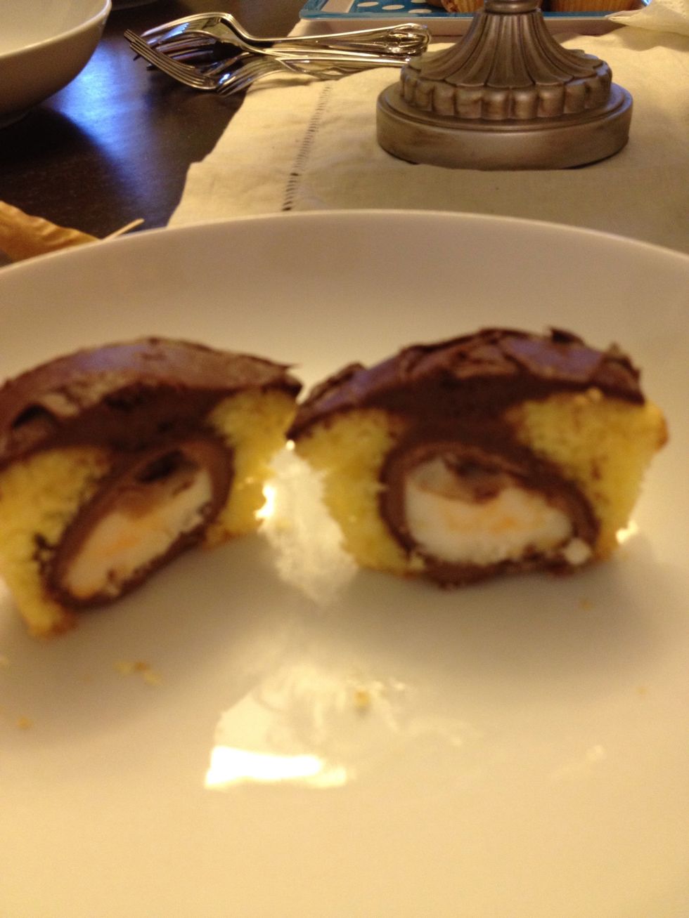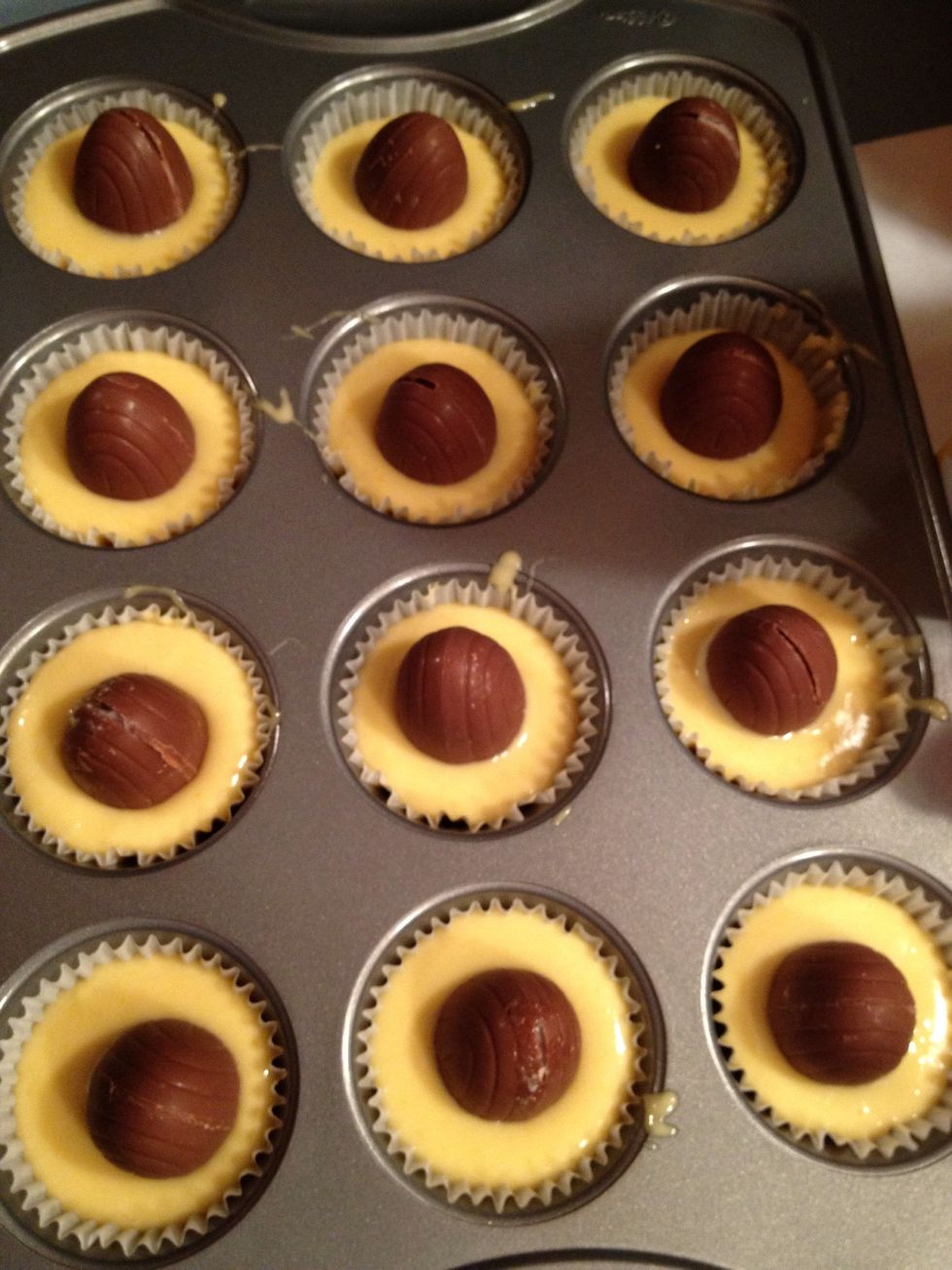 Fill cupcake tins about 2/3 of the way. Once filled, stick a frozen Cadbury egg into the batter.