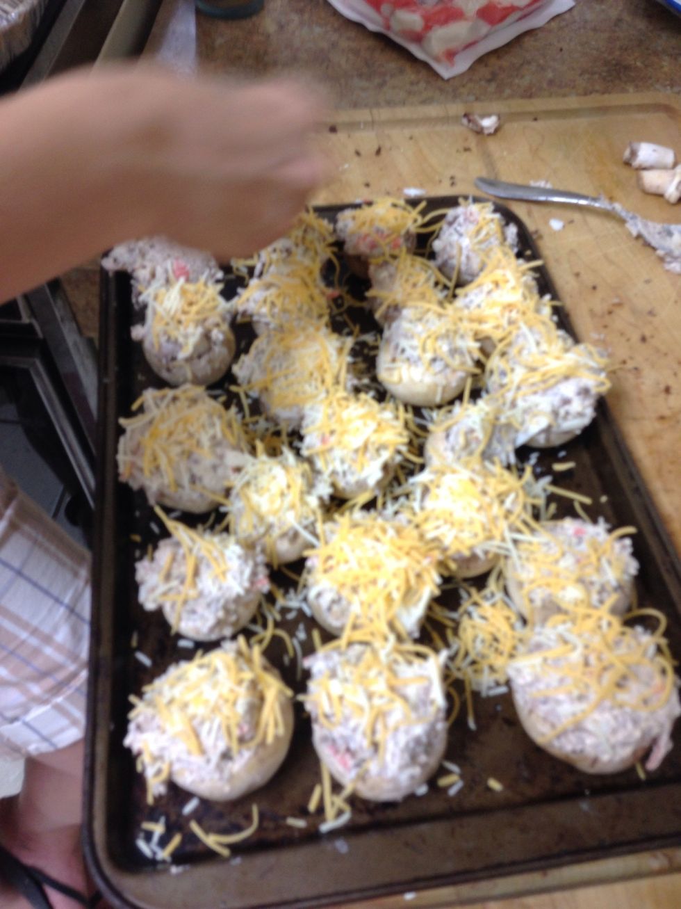Put caps on baking tray and top with Colby cheese.