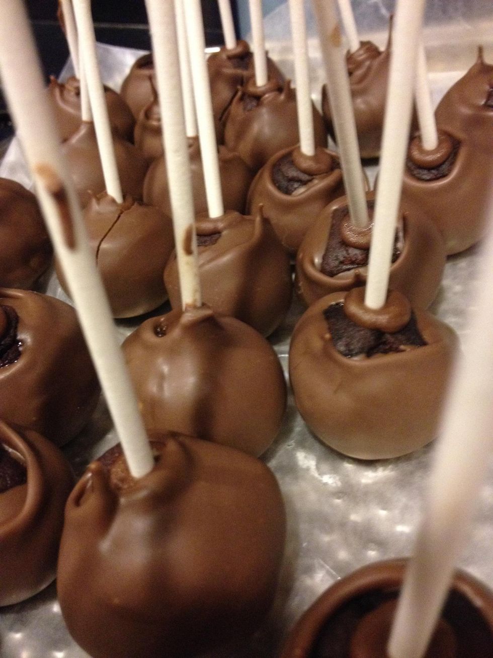 Dip a lollipop stick into the chocolate and put it into the cake ball. Allow the chocolate to cool for 5-10 minutes