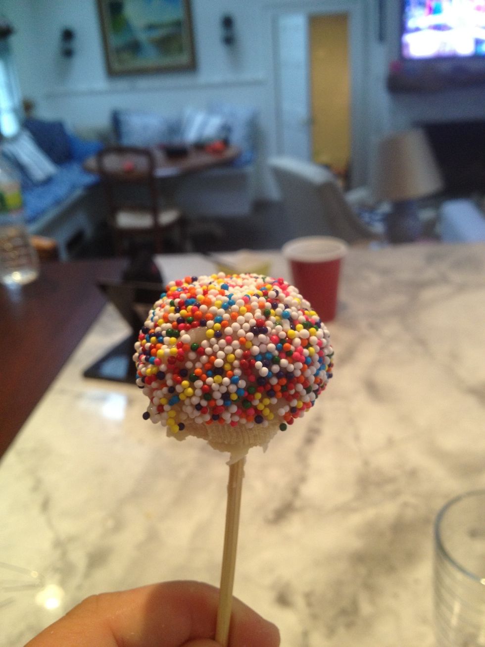 Dip horizontally the cake ball on the stick in the chocolate, be careful the cake ball doesn't fall off
