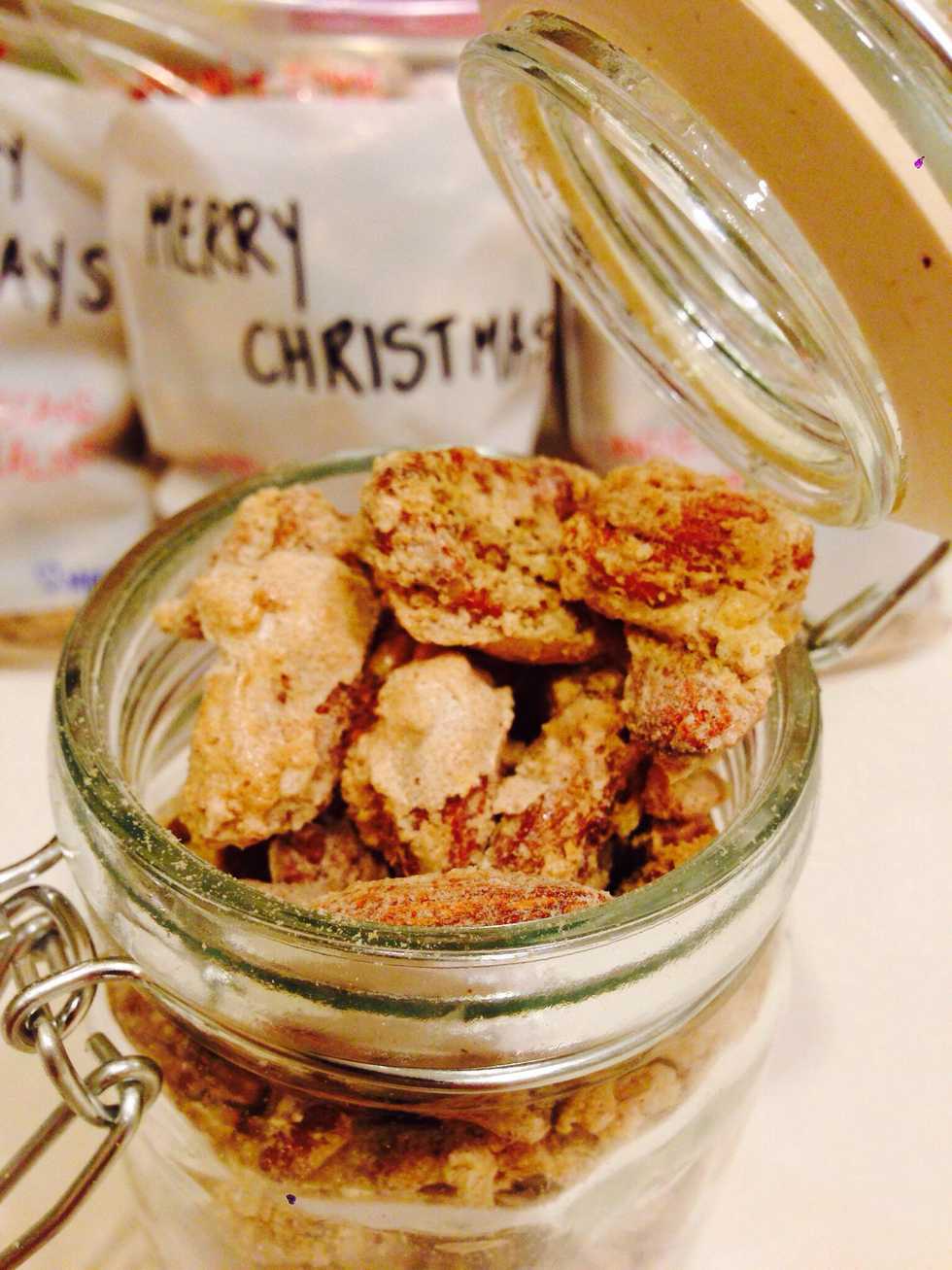 Any nuts work but pecans are awesome! The ratio for the recipe is 1 egg white to 1 cups of sugar to 1 teaspoon of cinnamon to 1/2 teaspoon of salt to 1/4 teaspoon of nutmeg to 4 cups of nuts.