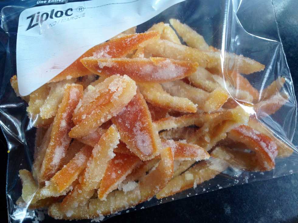 Remove from pan. Place in baggie, add 1/2 cup or more sugar. Shake to coat the peels. Place and spread on plate and let dry overnight. Next day put in a new baggie. Store it in the fridge.
