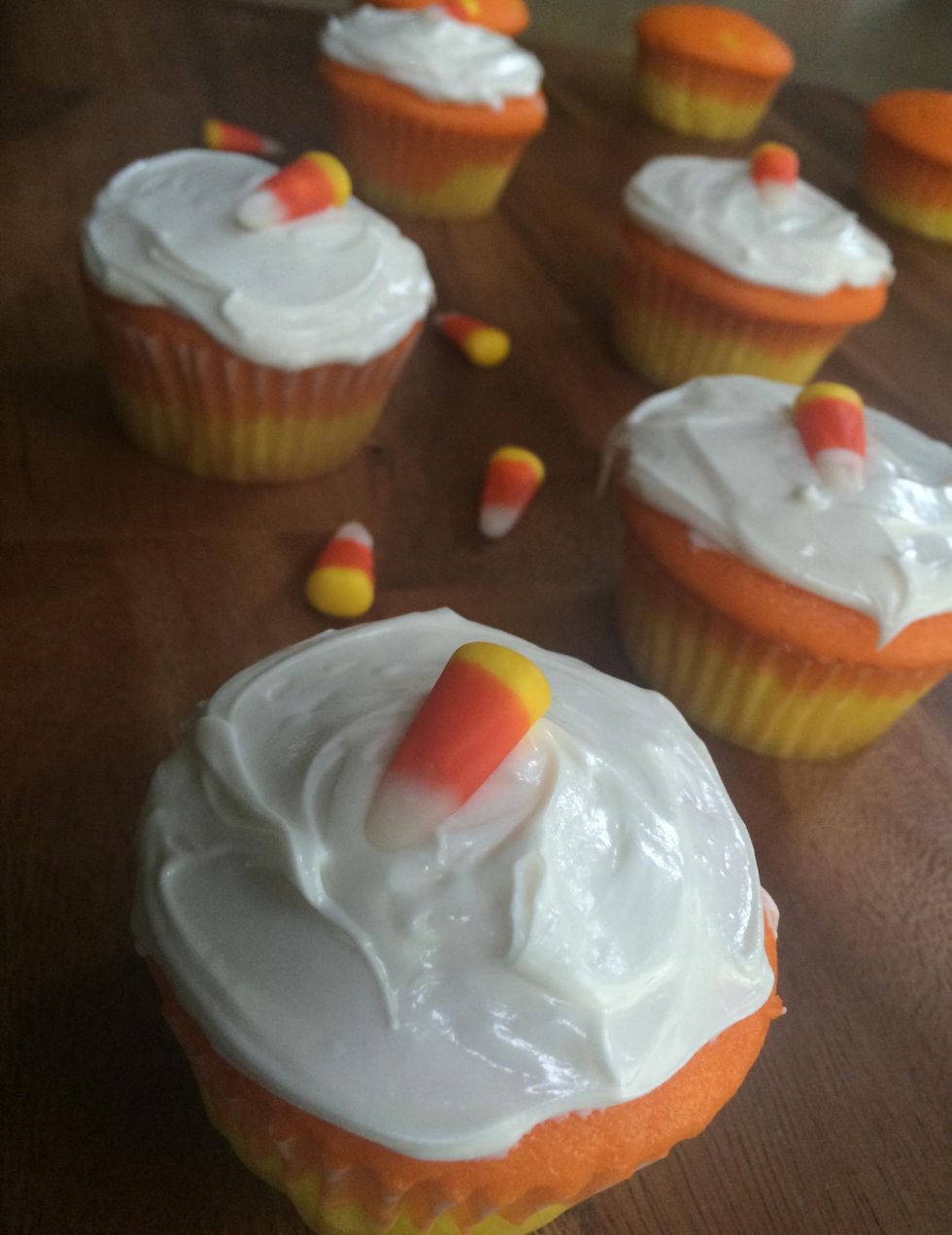 Top with your favorite vanilla icing and place a candy corn on top of each cupcake!