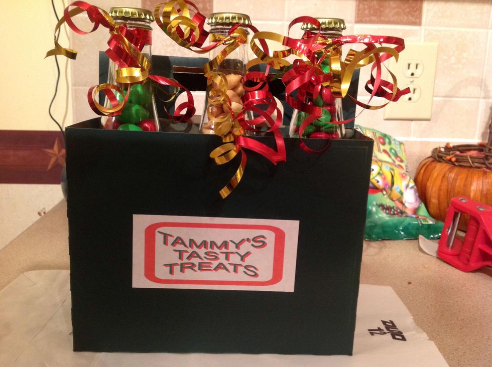 Spray paint a six pack carton, put labels on everything, decorate with curly ribbon. Six Pack includes 3 candy vodka bottles and an assortment of 3 snacks. GREAT GIFT!!!!!!!