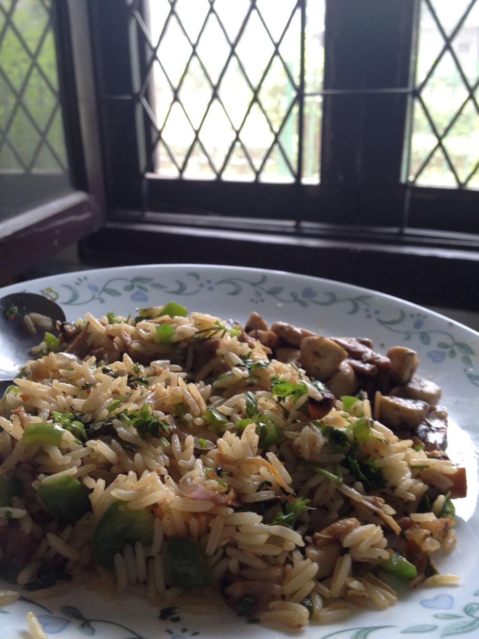 After the sautéed mushroom are made add them to the fried rice in the other pan.