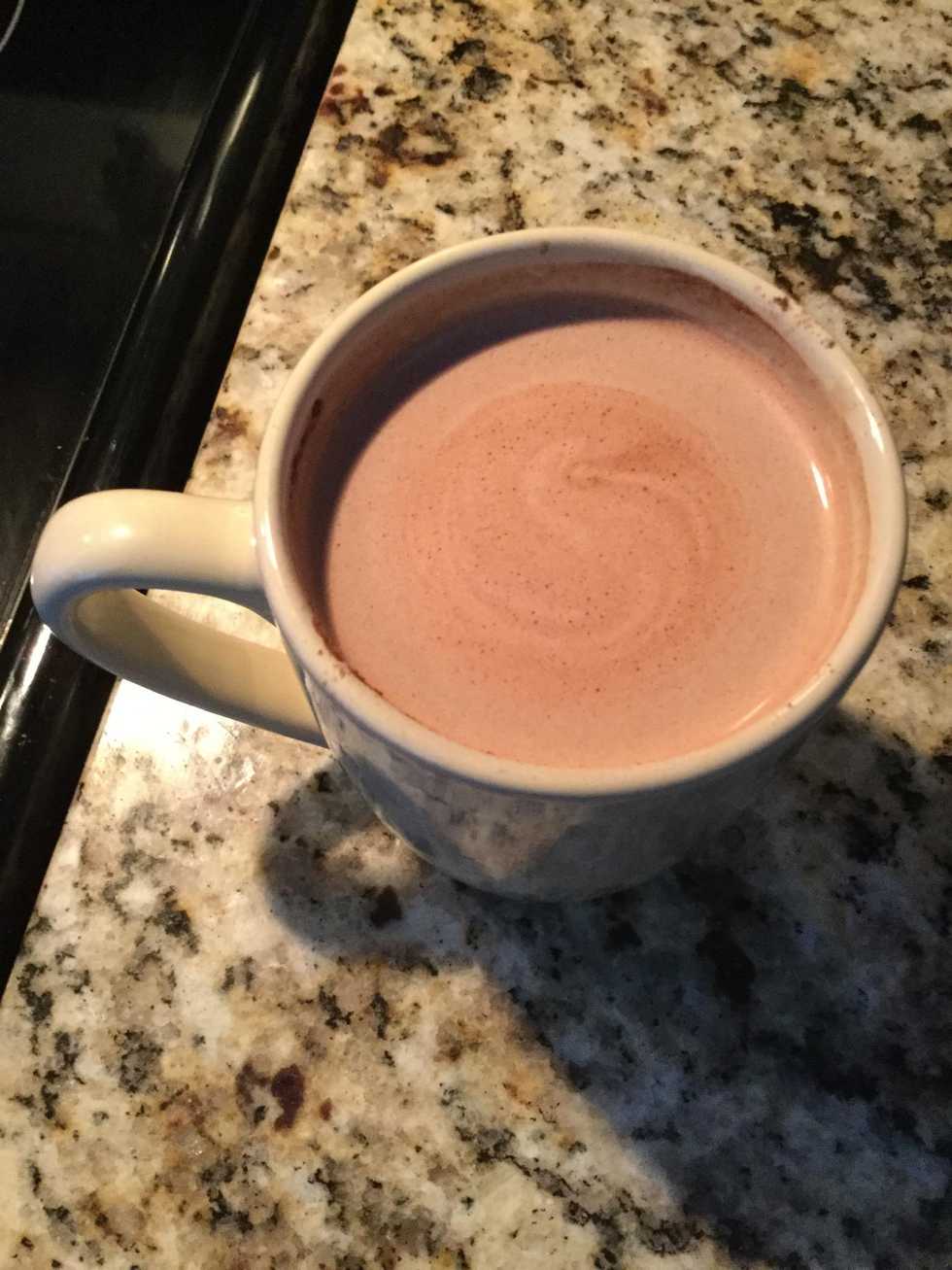 Warm it up (about 1:00 in the microwave), and add your hot chocolate mix. Recipe on the next slide.➡️