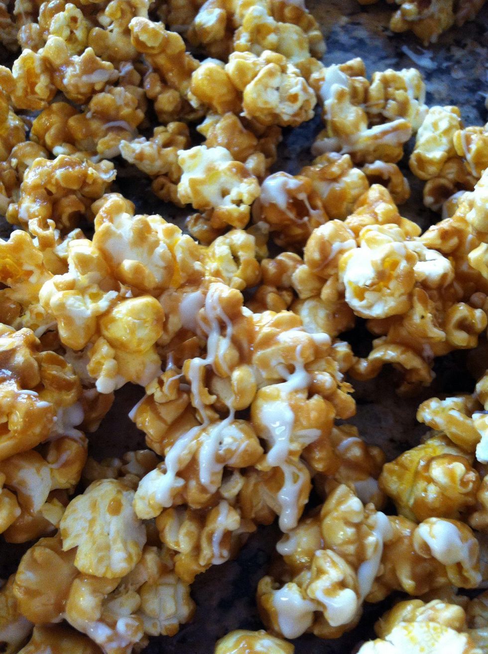 take a spoon and drizzle all the popcorn. Don't move the corn once the white chocolate has been glazed over. You don't want it coated you just want to see the swirls. Let it sit for about 30 min