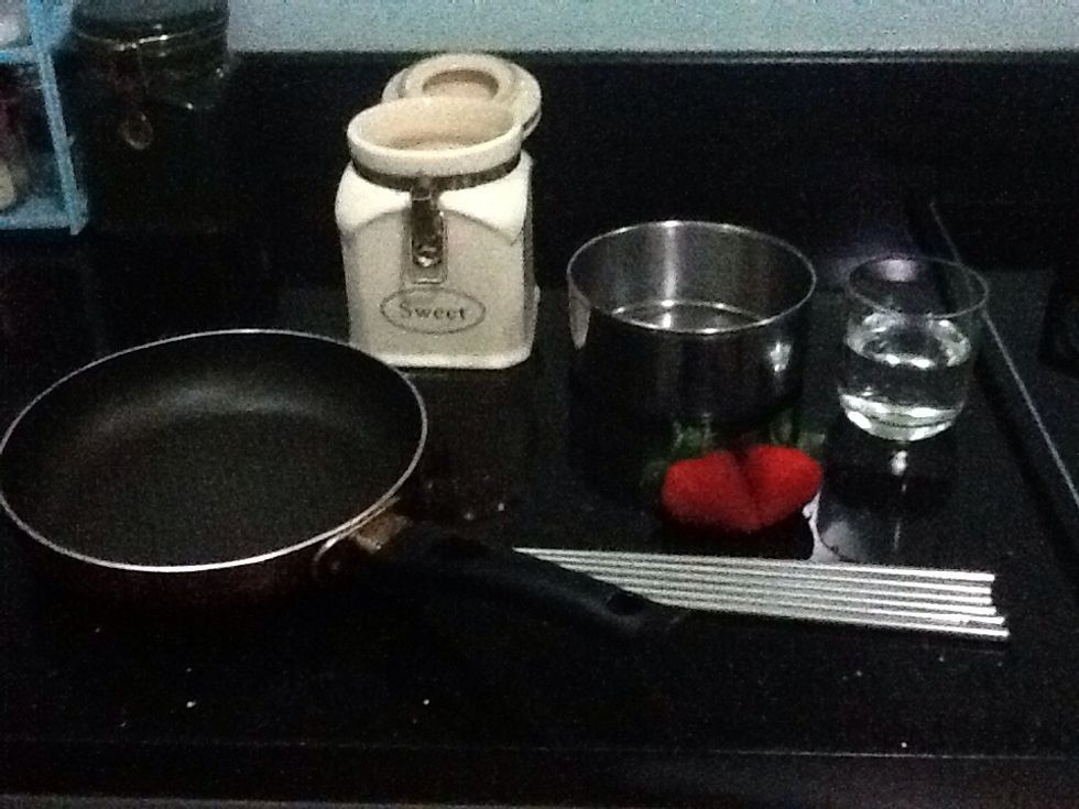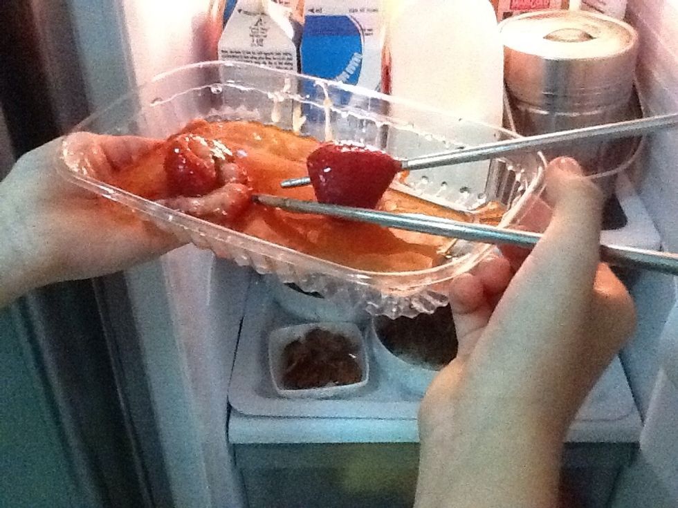 Take the chopsticks and poke them into the strawberry to keep the strawberries in place
