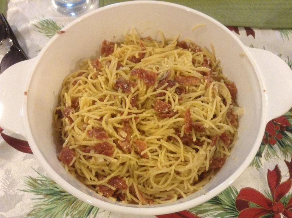 Add the bacon and mix with little olive oil. Mix the egg mixture then mix instantly. Add Apc then mix. Add Parmesan cheese.