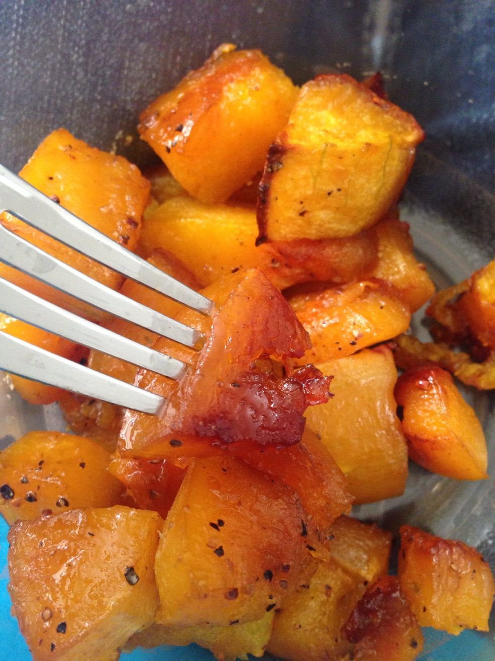 Take the outer part of the squash off with a peeler or knife. Cut the squash into 1 inch cubes and place in a baking pan.