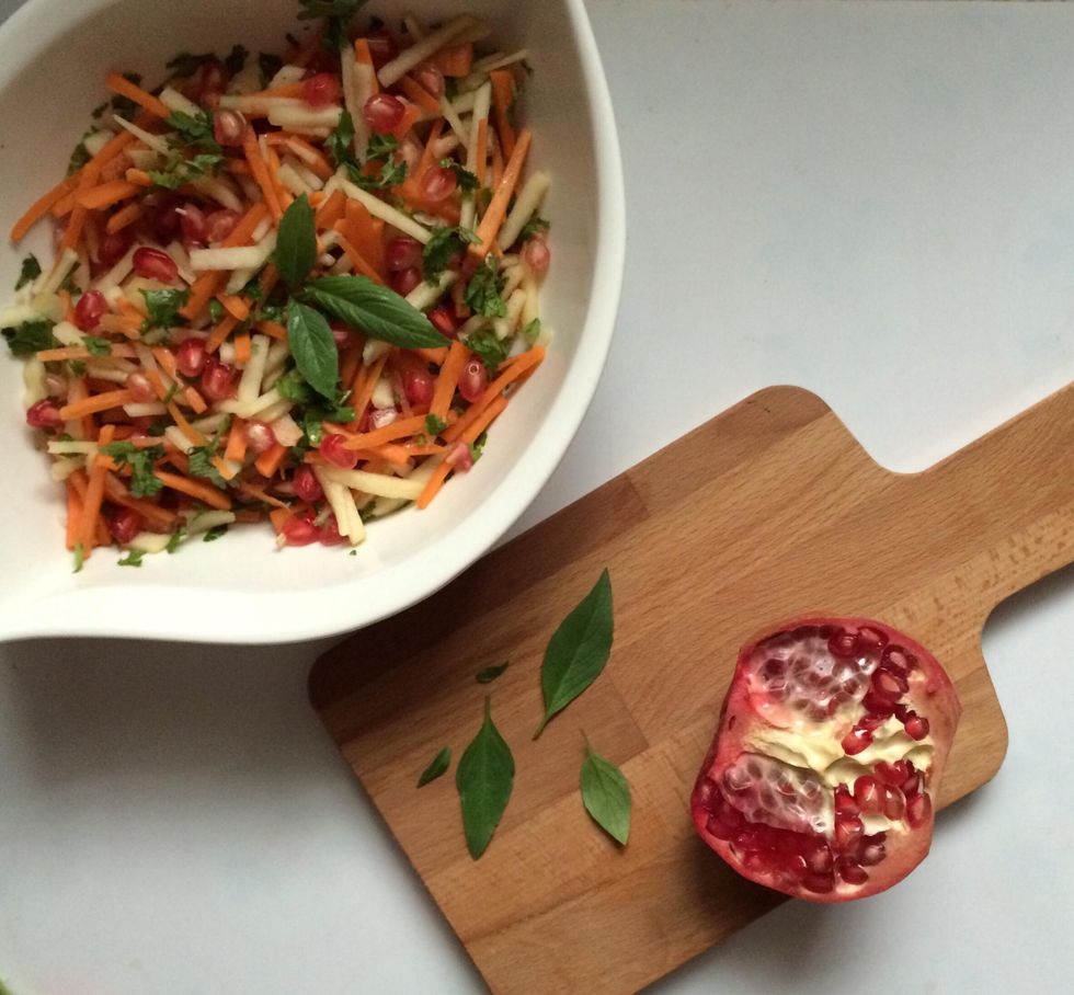 Squeeze orange juice into the salad, and pomegranate seeds. Drizzle olive oil
