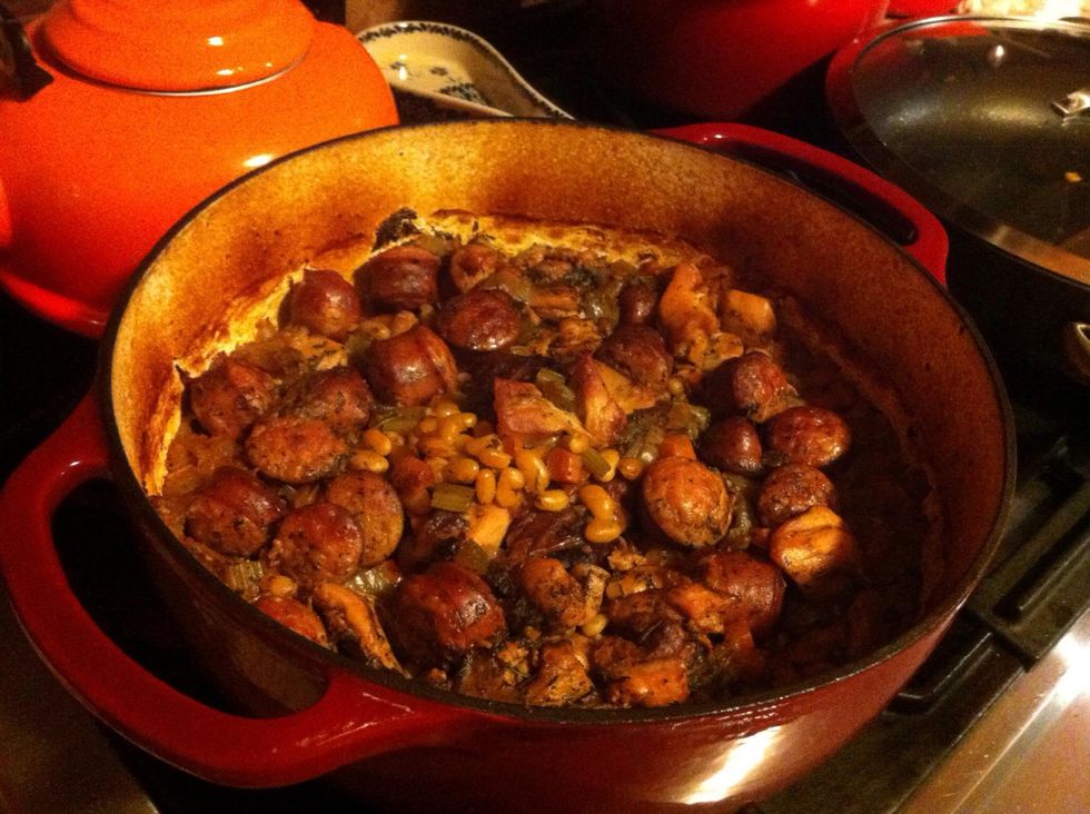 Cut chicken and kielbasa into 1 inch pieces. In large oven-safe Dutch oven, heat 1 Tbsp oil. Add chicken and cook until brown on all sides, about 7 minutes. Remove to a serving bowl.